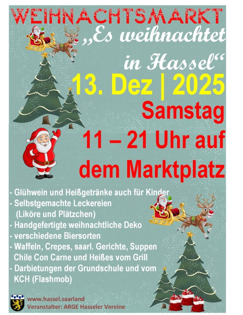 St. IngbertKultur & Tourismus Veranstaltungen (A-Z)Weihnachtsmarkt Hassel 13.12.2025 Weihnachtsmarkt Hassel Am Samstag, 13. Dezember 2025, verwandelt sich der Hasseler Marktplatz in einen funkelnden Weihnachtsmarkt. Ab 11 Uhr öffnet er seine Pforten und lädt Bürgerinnen und Bürger sowie Familien ein, die besinnliche Zeit des Jahres gemeinsam zu feiern. Zum Kalender hinzufügen Google Kalender iCalendar Outlook 365 Outlook Live Veranstaltungs-Informationen Details Datum: 13.12.2025 Kategorien:app-IGBevents, Veranstaltung Veranstaltungsort Weihnachtsmarkt Hassel Hassel, Deutschland Google-Karte anzeigen Veranstalter Weihnachtsmarkt Hassel